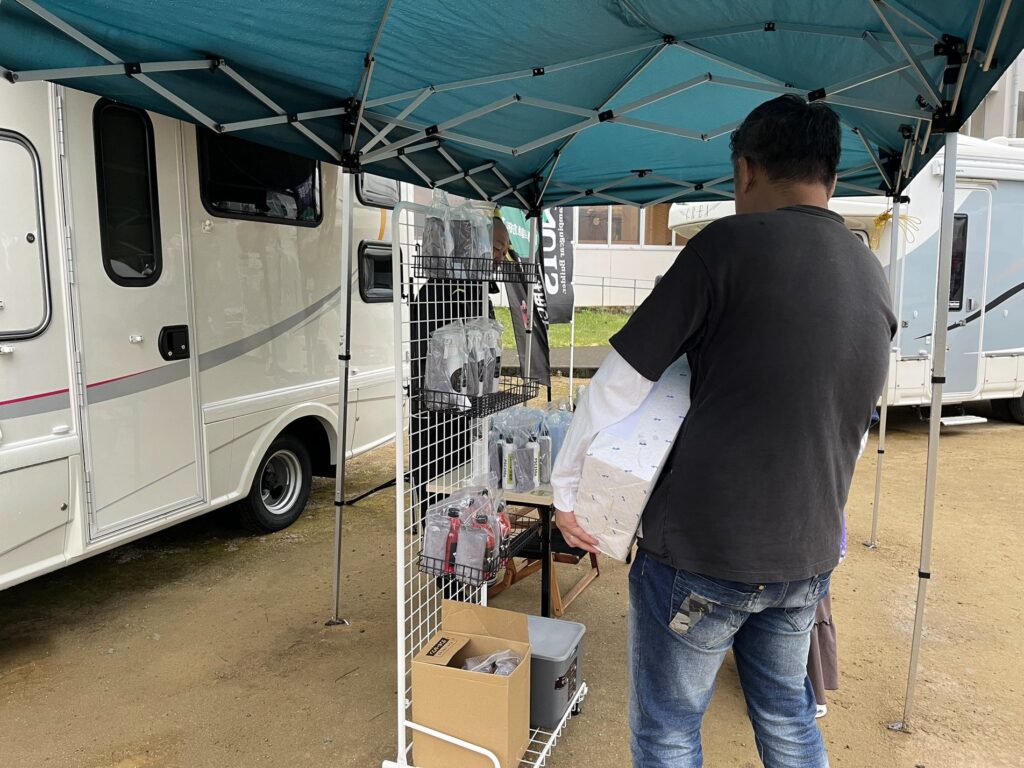 車に戻る際 協賛出店のキャンピングカー洗車洗剤を扱うSHOP ケンズ キャンピングカーファミリー 洗車好きなアキが興味深々