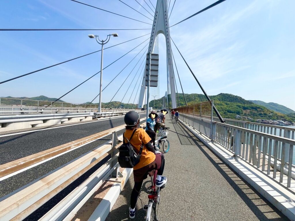 しまなみ海道はサイクリングロードが完備されており 車道の一部が青く塗られていて 自転車道路となっています