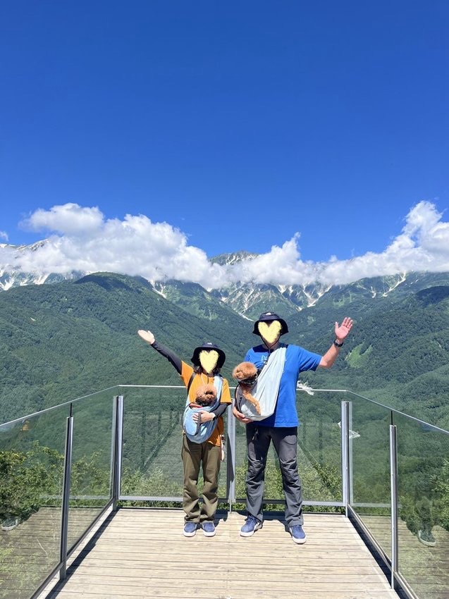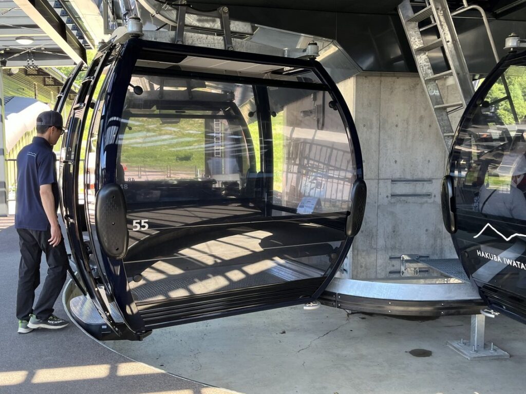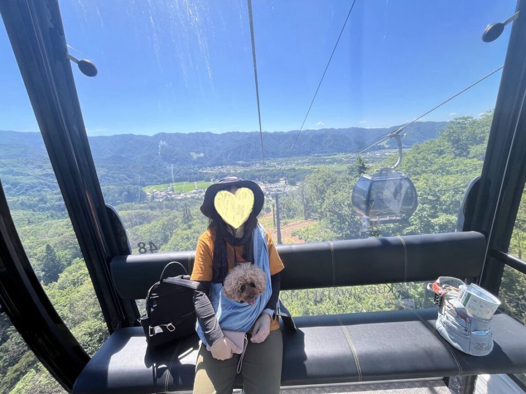 以前行った時に乗ったゴンドラリフトは 音と振動が大きくて ビビりのリオンはスリングの中でブルブル震えていましたが 2024年冬に新しく出来た 新ゴンドラリフトは乗車人数も増え 時間も短縮され 乗り心地が格段に良くなっていました