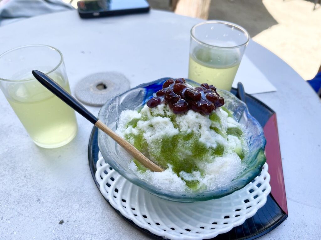 かき氷が 冷たくて甘さ控えめでさっぱり とっても美味しい〜〜生き返る〜〜