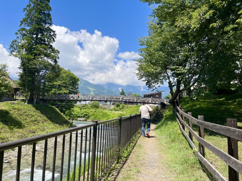 公園内を流れる 清流姫川にかかる吊り橋 大出吊橋や茅葺き屋根の古民家はのんびりと散歩を楽しむのにピッタリ