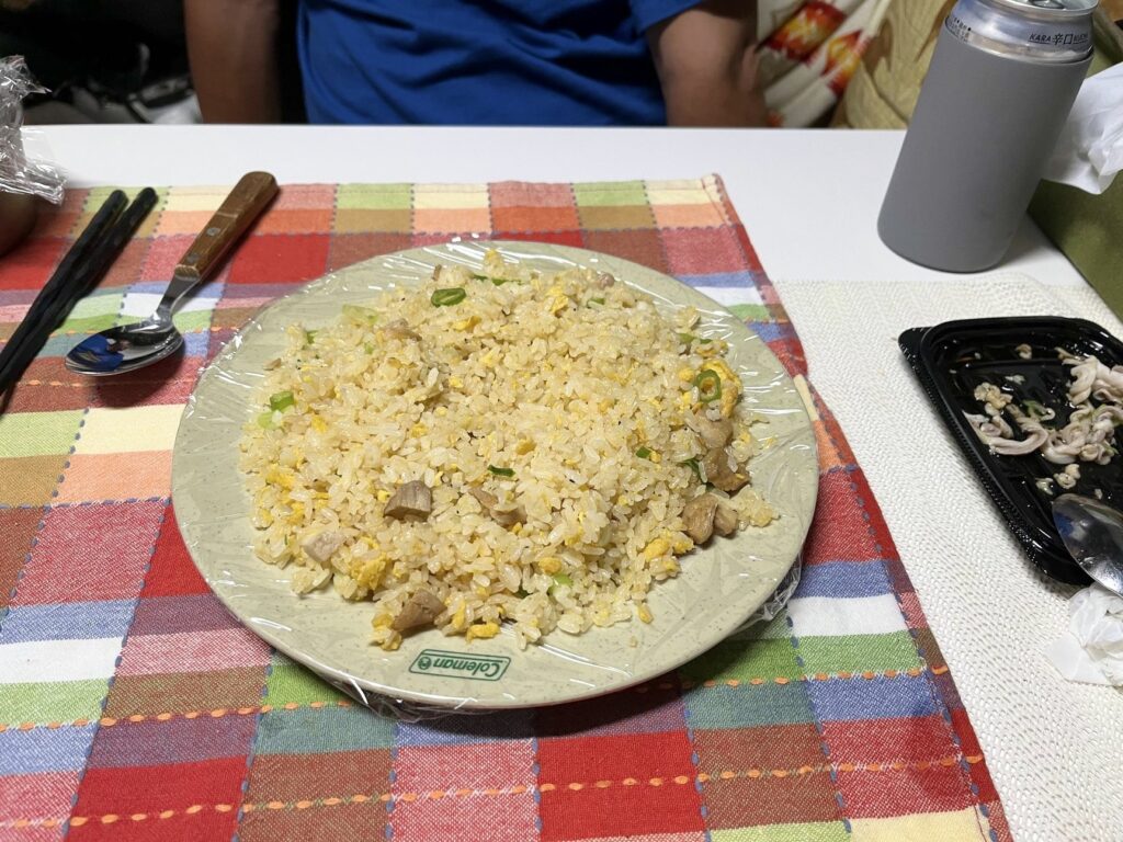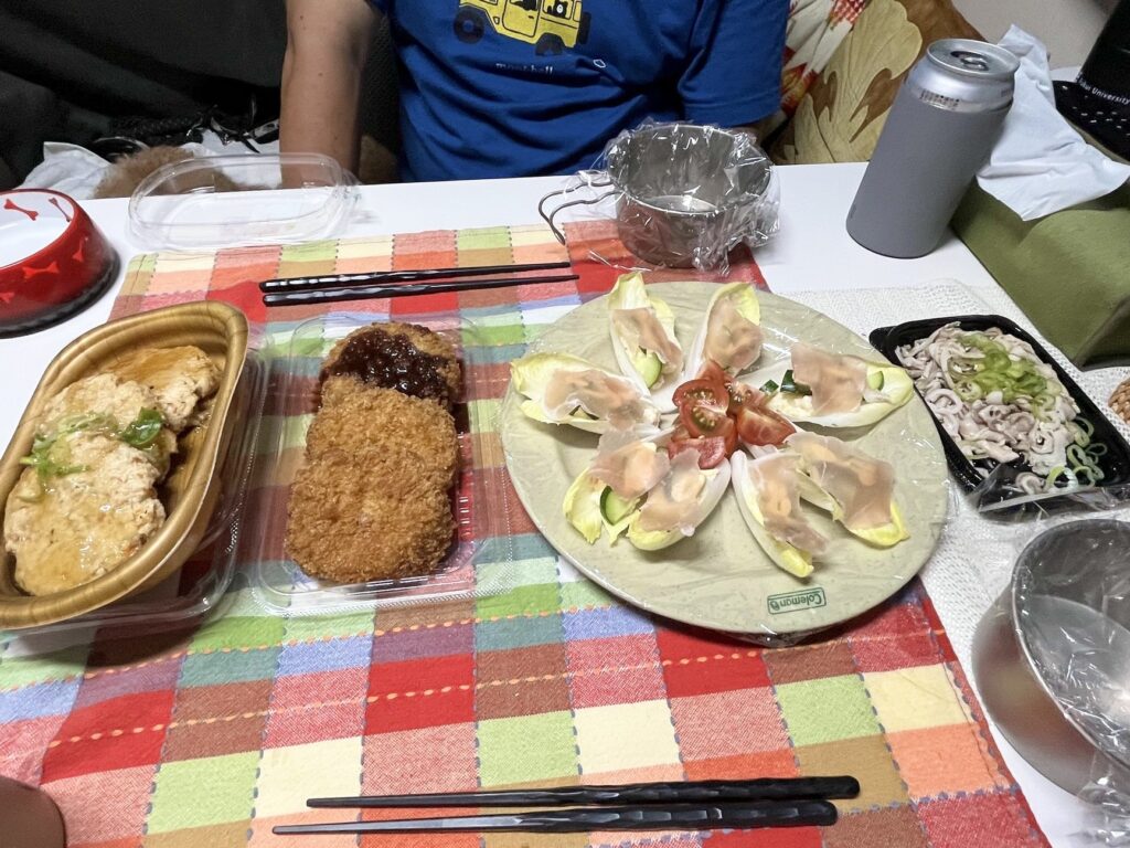 夕食はスーパーで買ったお惣菜 少し足りなくて後から冷凍チャーハンをチンして頂きました