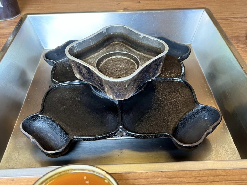 すると みた事ない変わった鍋が登場〜〜 義経鍋という鍋で頂くスタイル 真ん中は塩湯が入っていて ここでキャベツなどの野菜を茹でて お肉と共に頂きます